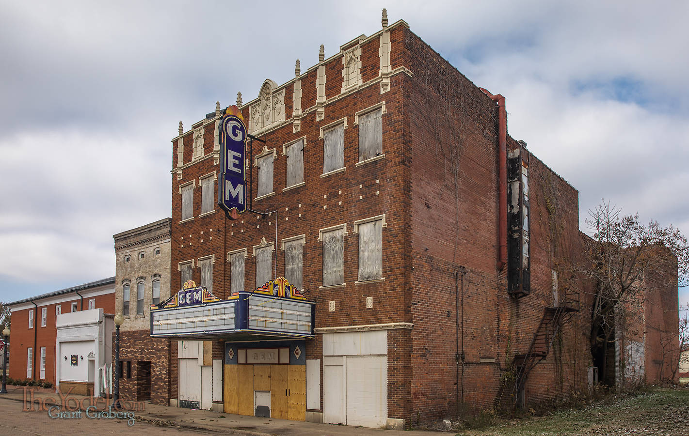 The Gem Theater in Cairo, IL. on the right side of it there is a big gap in the wal that has a tree whose trunk is about 14" growing out of it. I'm guessing they don't sell popcorn anymore.