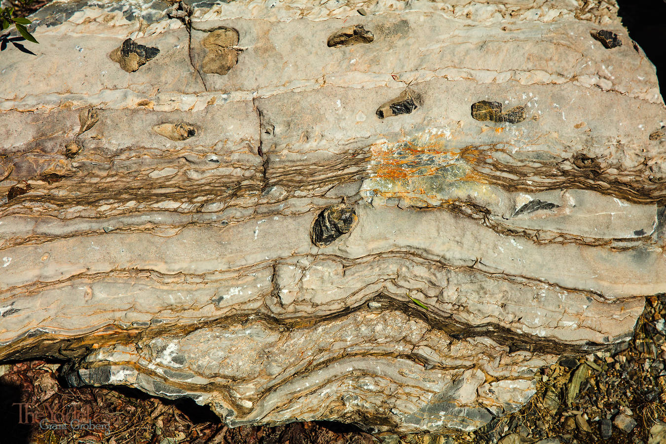 Look at those layers! Thin, dense layers. Thick, porous layers, with chunks of obsidian embedded. What a story! This rock is about two feet up and down and three feet wide.... About 500 lbs and way up on the side of a hill... it is still there.