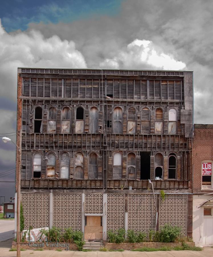The brick facade on the front of this building in Cairo, Illinois has fallen away leaving the inside of the interior walls exposed