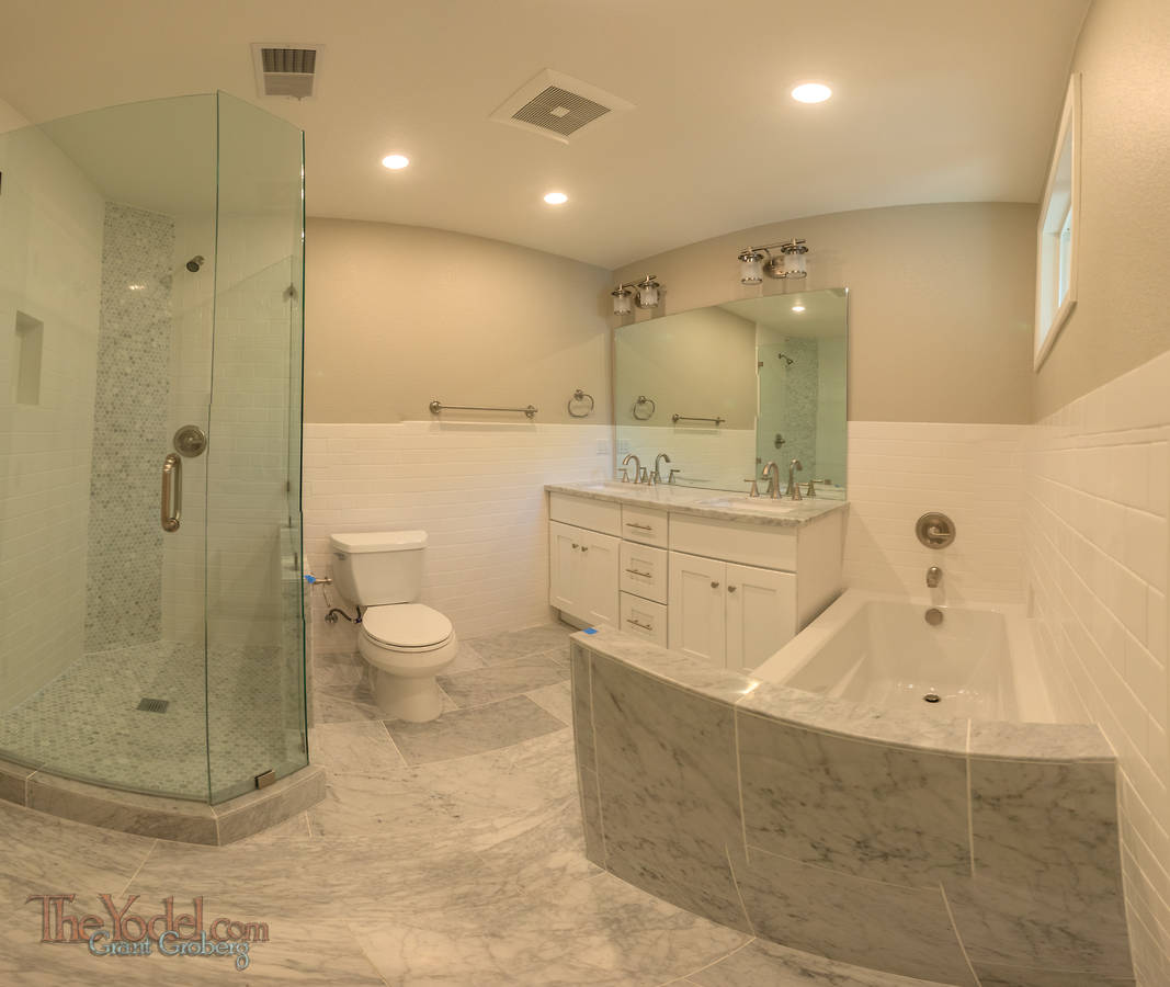 A Giant-wide image of the new master bath. You can start every day with a tough decision... "Do I take a Shower or a bath?"Marble floors white tile on the walls. Just like the Romans! Those floors suck the heat right out of your feet.
