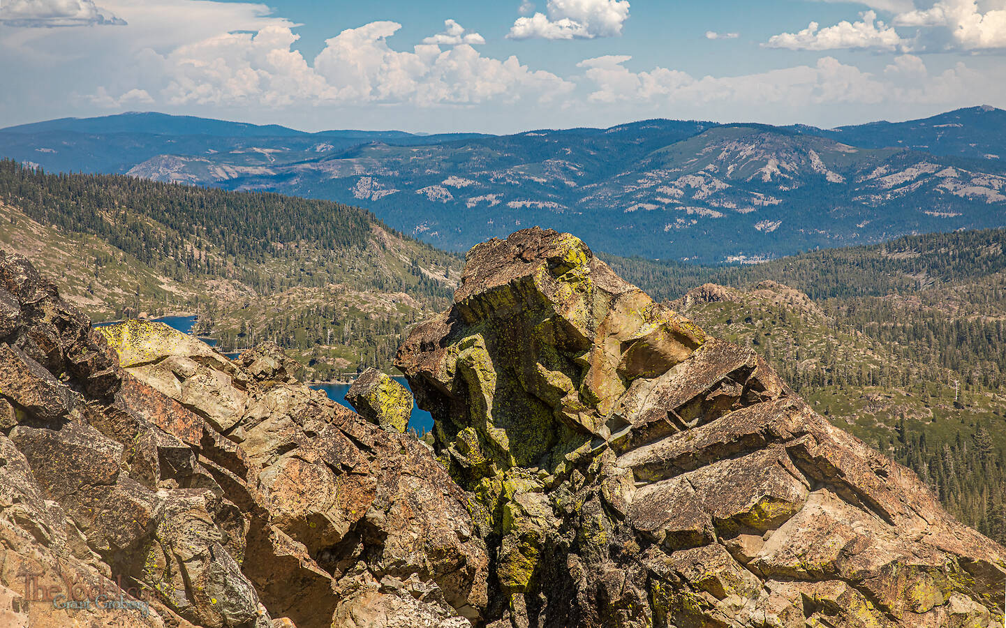 This picture would be a lot more interesting if I was about 30 feet farther down the slope. But it was a steep slope of slippery, broken rubble ending in precipice of I-don't-know-how-far down. Trusting my clumsy oafishness, I settled for this picture... What I find most interesting is the smaller block just left of center. You can see the lake behind on both sides and it looks balanced... just so.