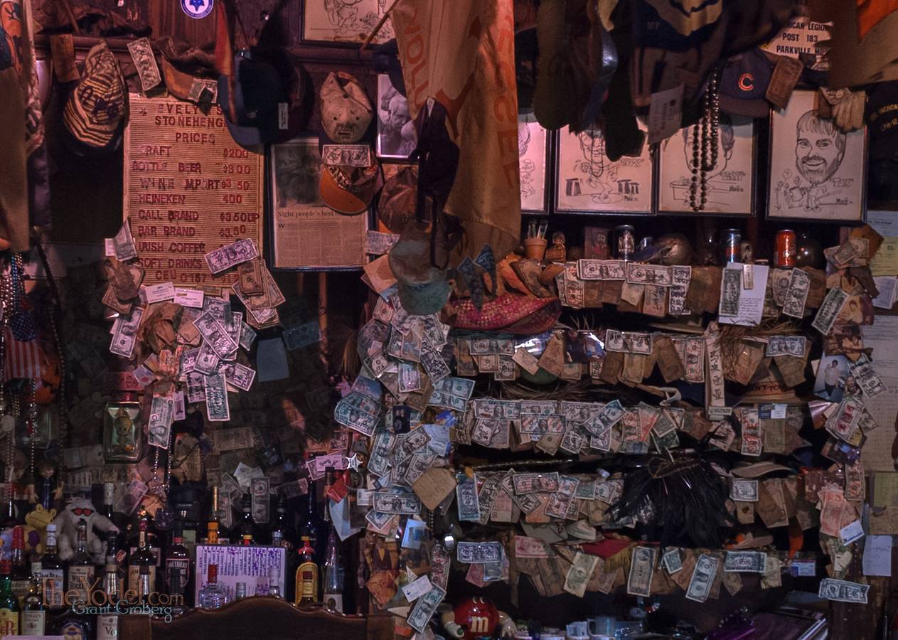 Behind one side of the Bar at Evelyns Place. The drink menu in the Middle has draft beer at $2.00.