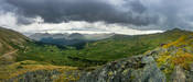 The weather was not quite bright & sunny. Sleet began to fall when I reached to top, but I did manage to snap a pic with the phone. On my decent I came across a group of what I can only guess to be White Tailed Ptarmigans in their Beige & Tan summer dress. They, too, seemed a little put out by the sleet.