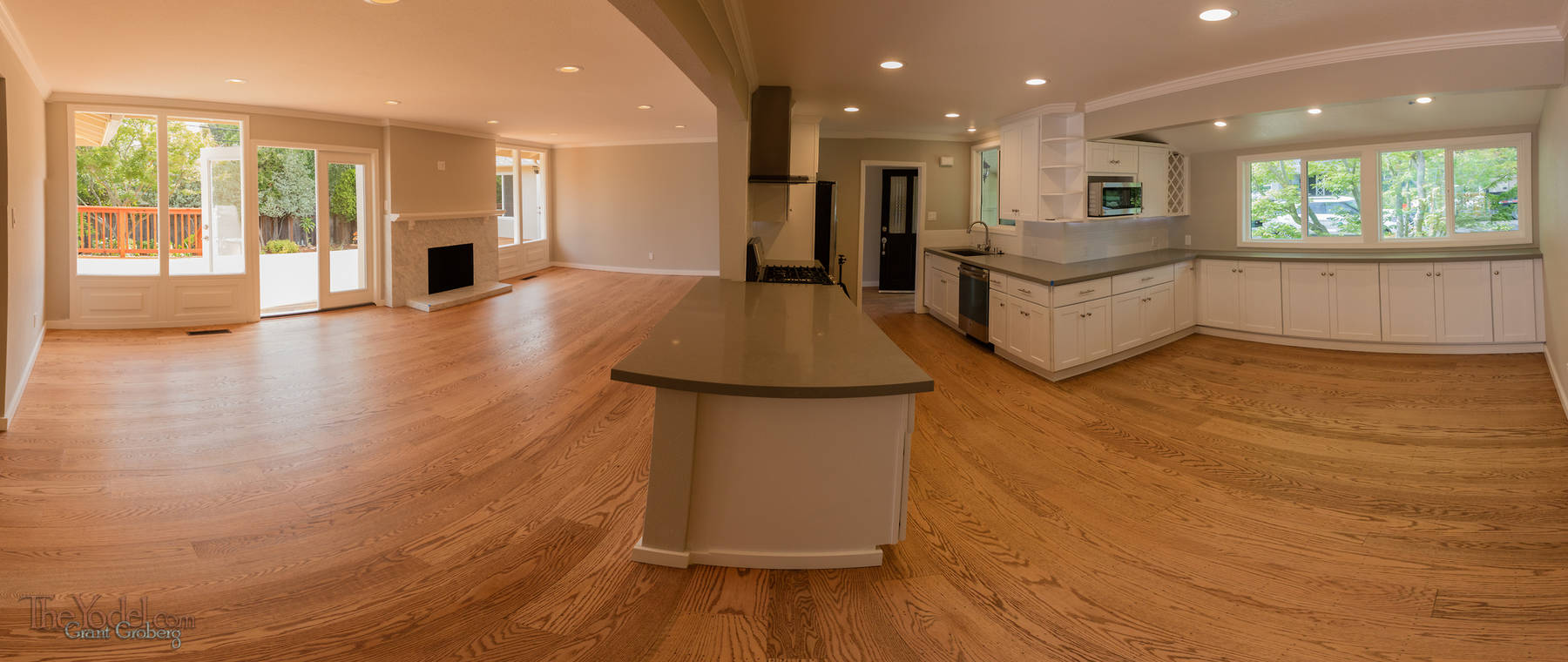 Two weeks later.... Really... It's April 26th. The deck is finished. The yard is done. if you walk through the house you will see a few bits of blue tape here & there. These are little details that still need tweaking. But there aren't a lot of them. This is a185° wide, panoramic image. Yikes.