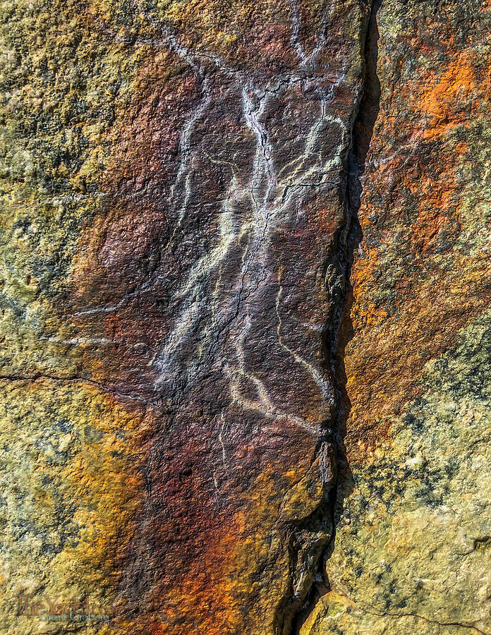 It is interesting to see how fractures in a rock stain the surface. In this chunk of granite it seems that the cluster of micro fractures transported iron or something that made the larger brown stain & seem to have, more recently, been been highlighting the lines with white.
