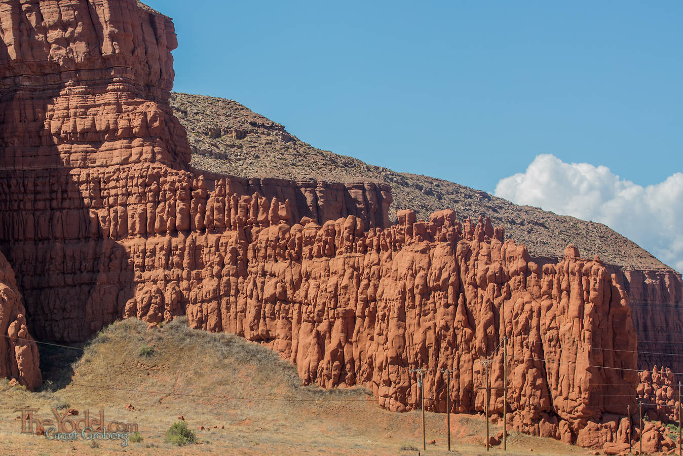 This formation is a single row jutting out from the mesa. a natural 60 foot high fence.