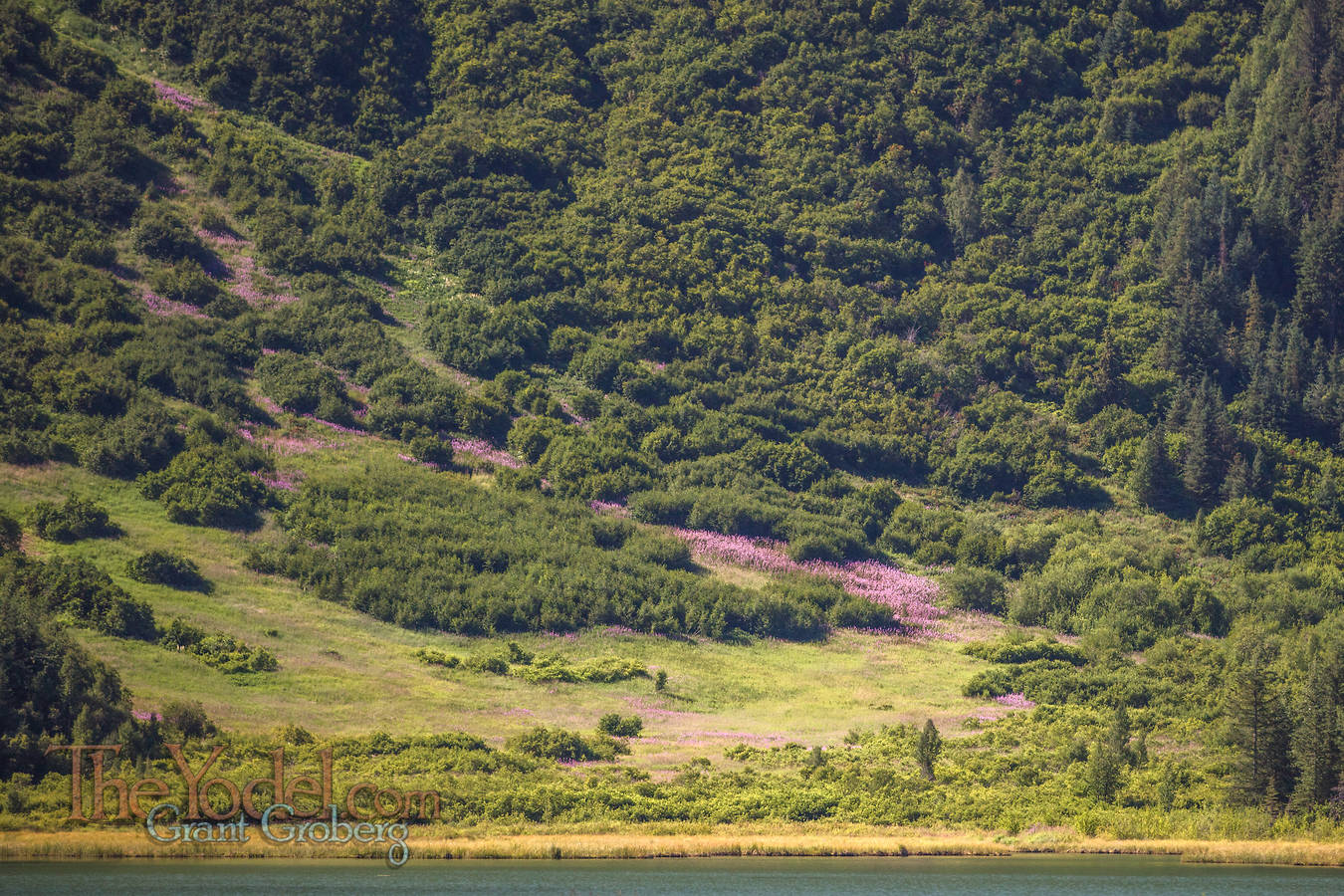 Throughout the northwest lands you will see these magenta wildflowers. They are tall with many flowerets that bloom in sequence so they are painting the roadsides much of the summer. Here they are cascading down a hillside on the far side of a lake.