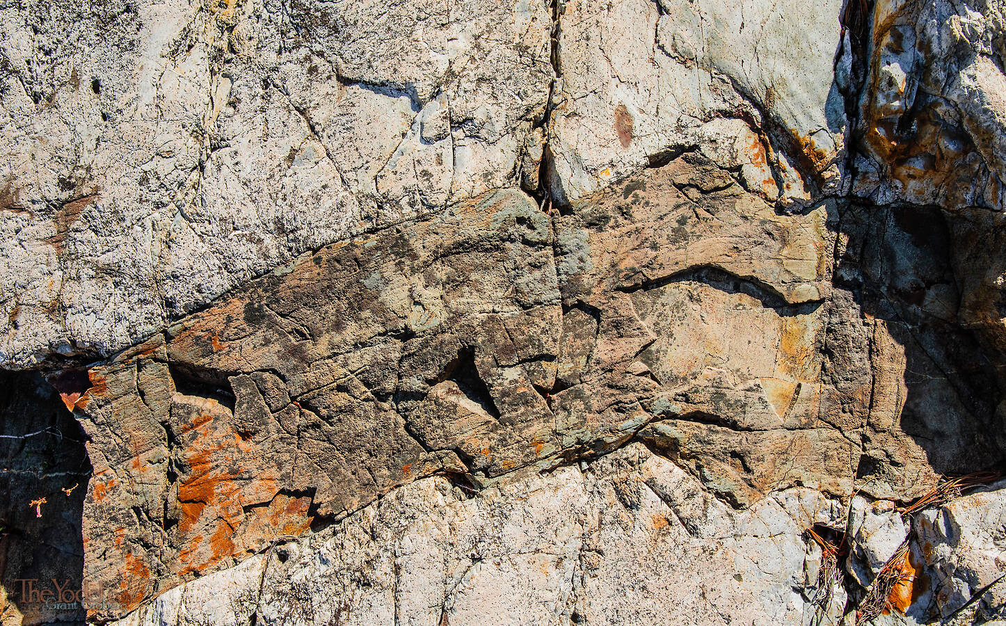 Once upon a time, deep under ground, the lighter colored stone developed a crack or two... as, it seems, they always do. Later there was an event that injected some magma into said cracks filling them neatly and precisely. A few million years later the original block of stone was uplifted to the surface and eroded back down to expose this nice zig-zag pattern. And all of this just for your viewing pleasure!