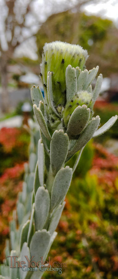 It is the middle of February now. When I showed up the protea had started to bud & bloom. This diminutive bud will become a rather startling, bright yellow skyrocket.