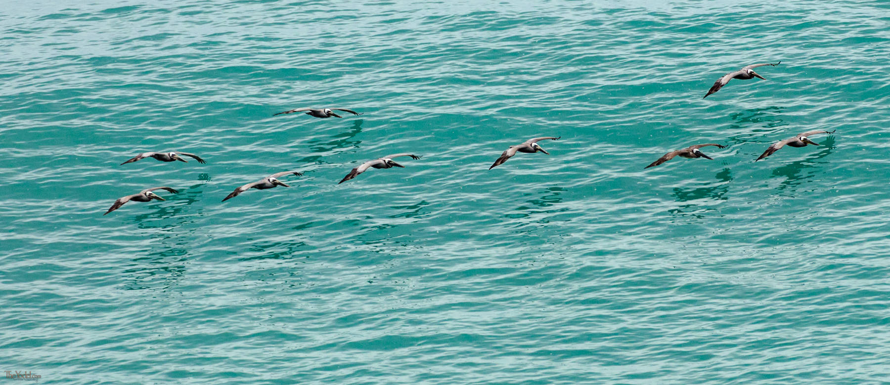 A pod of pelicans gliding along the crest of an ocean swell.