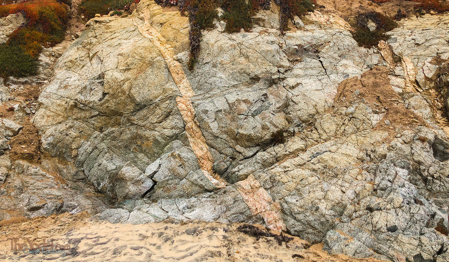 ...And you come across this lovely event The wall here is, perhaps 25 - 30 feet tall. The pinkish vein is perhaps 14 inches wide at the base. You can see that the top two-thirds shifted to the left about a foot & a halt. Then the top third decided it wanted to go back to the right about 5 inches.