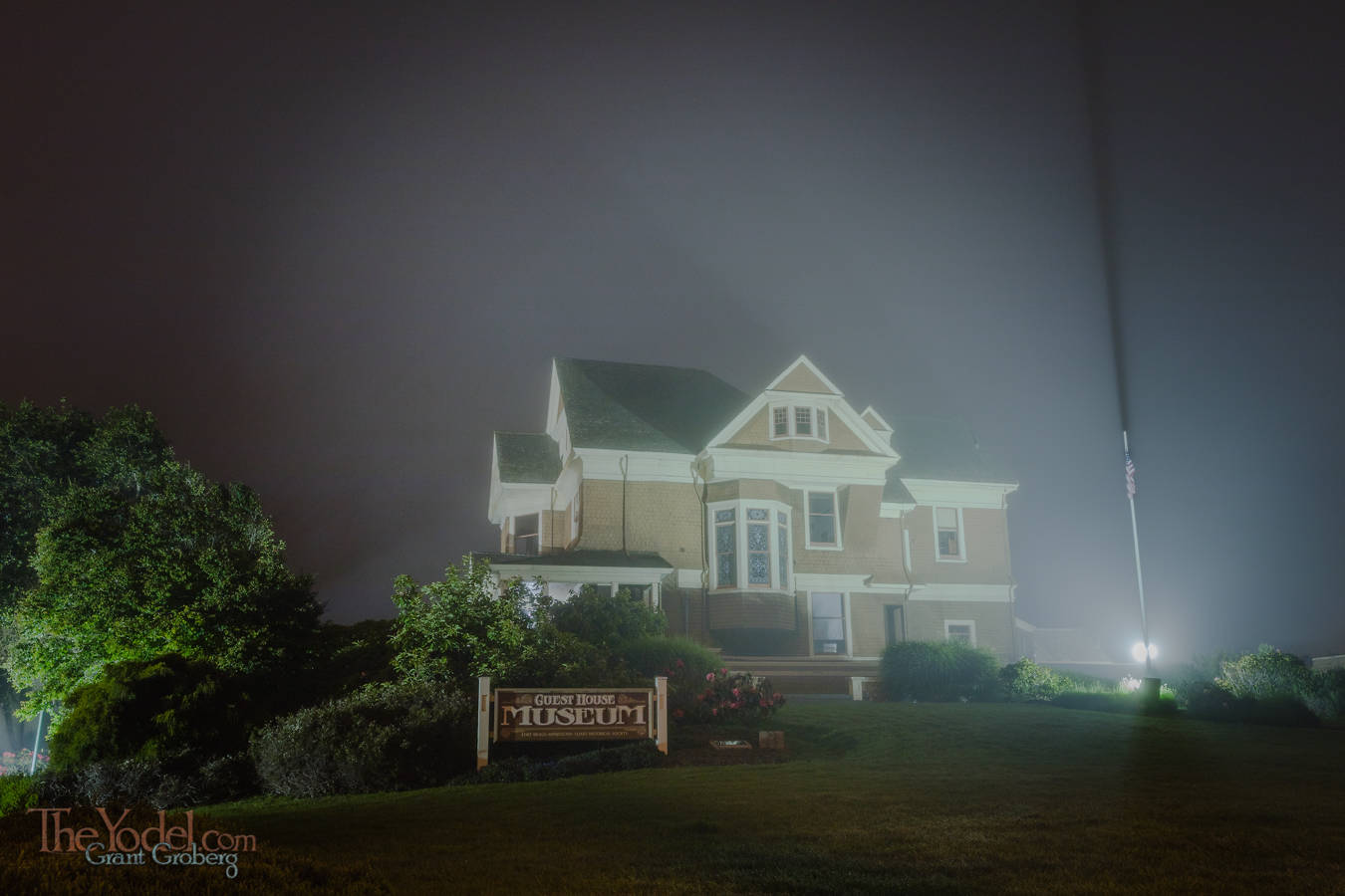 Lit by spotlights, the shadows cast by the Guest House Museum create the effect of intersecting crepuscular rays. Don't they realize youy're supposed to take the flag in at night?