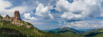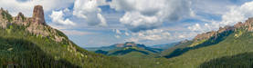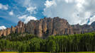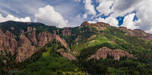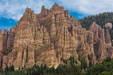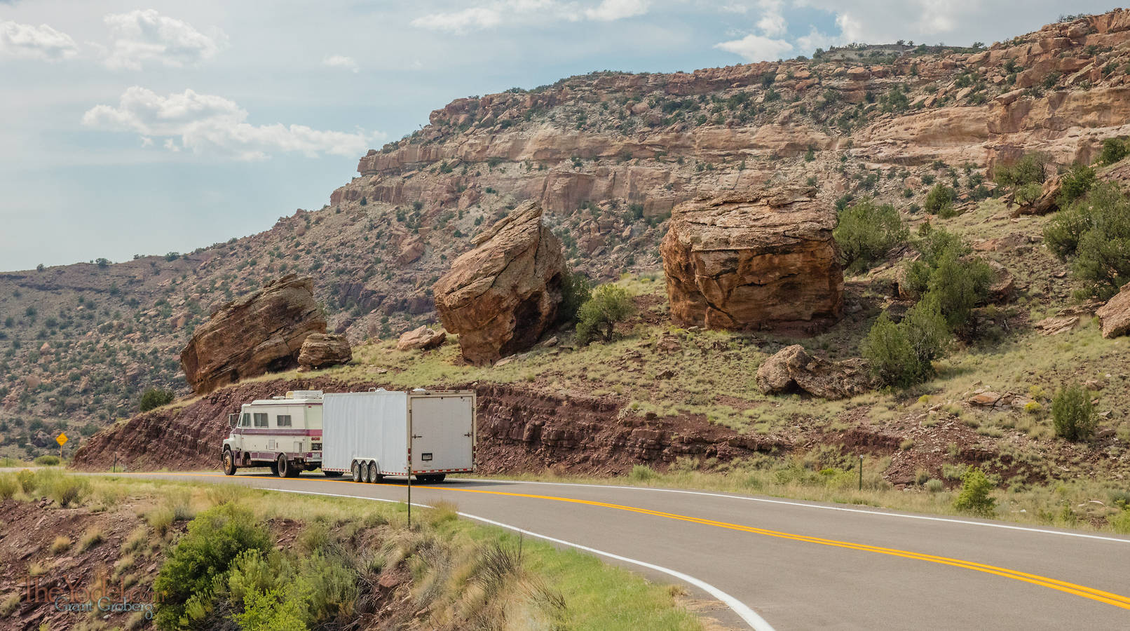 Joe Davis Canyon on Highway 141 in Colorado. Those rocks are big. On the ridge to the right one of the upper strata is thick and very strong, The underlaying strata is friable & erodes quickly undermining the hefty layer... Eventually these huge chunks break off and roll down the slope... None while I was watching... but I was ready for it!