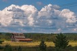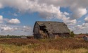 There is a hole in the side of this barn that looks like it has been there for a while. The grass is starting to grow from the bales of hay inside.