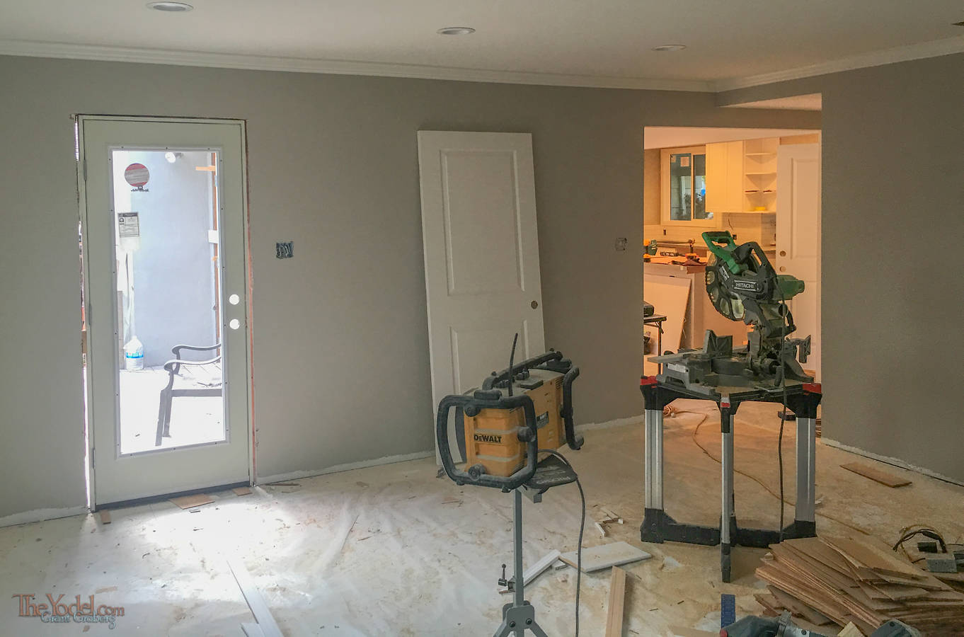 Work areas shift around too. The family room is a large space without much complicated stuff going on. so they set up the saw to do cutting in here.