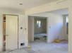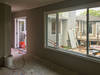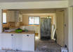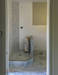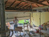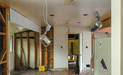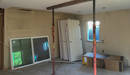 The floor here was water-damaged sometime in the 90s. There was a rug there & some water was sprayed on through the window saturating the rug and pad underneath. Rinse and repeat enough times and the flooring had shrunk and greyed out. Now amateur that I am I would have sanded out that one spot and tried to get it to match. Speedy professional Tranh simply removes the damaged boards and replaces them. The whole floor is going to be sanded & refinished anyway.