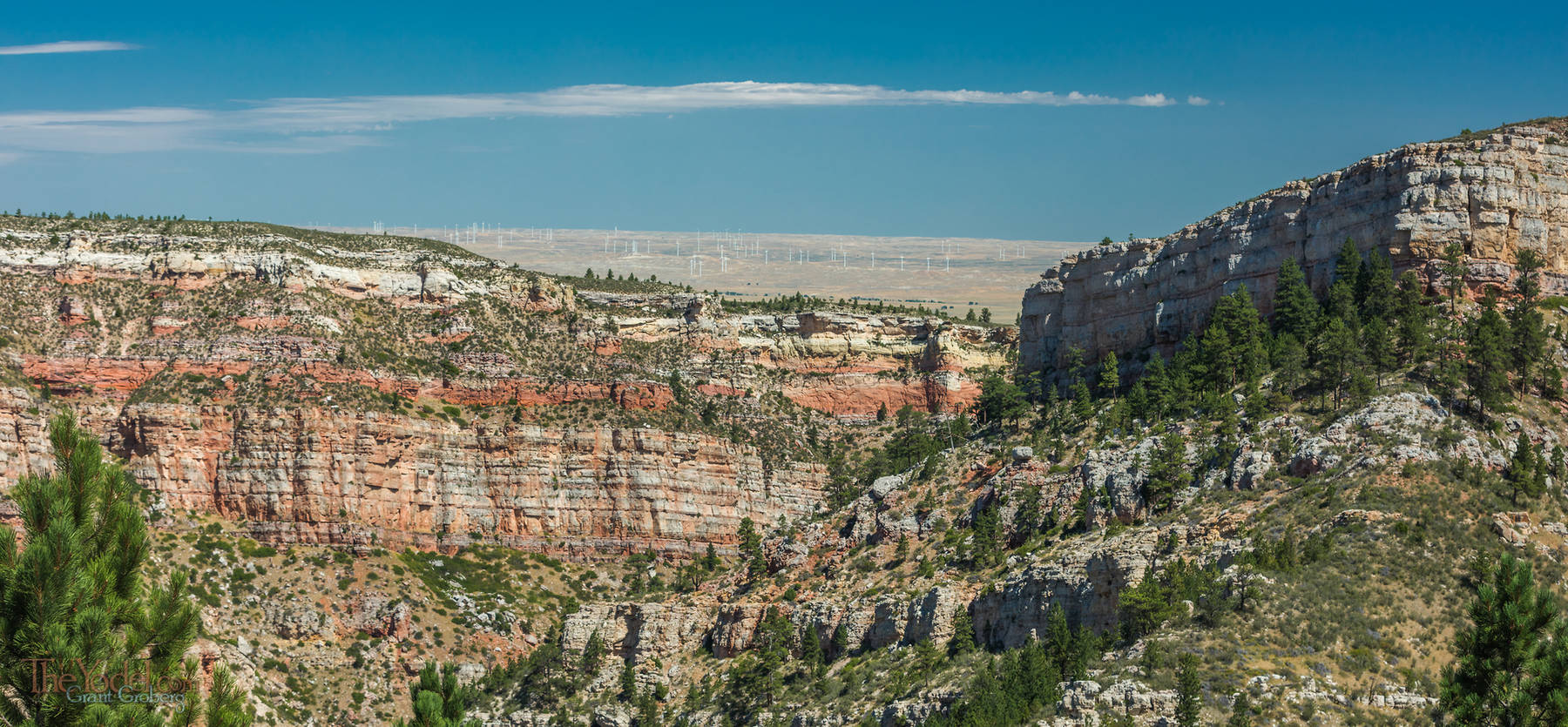 Red white red white red white.... colorful strata on this cliff face... lots of windmills off in the distance.